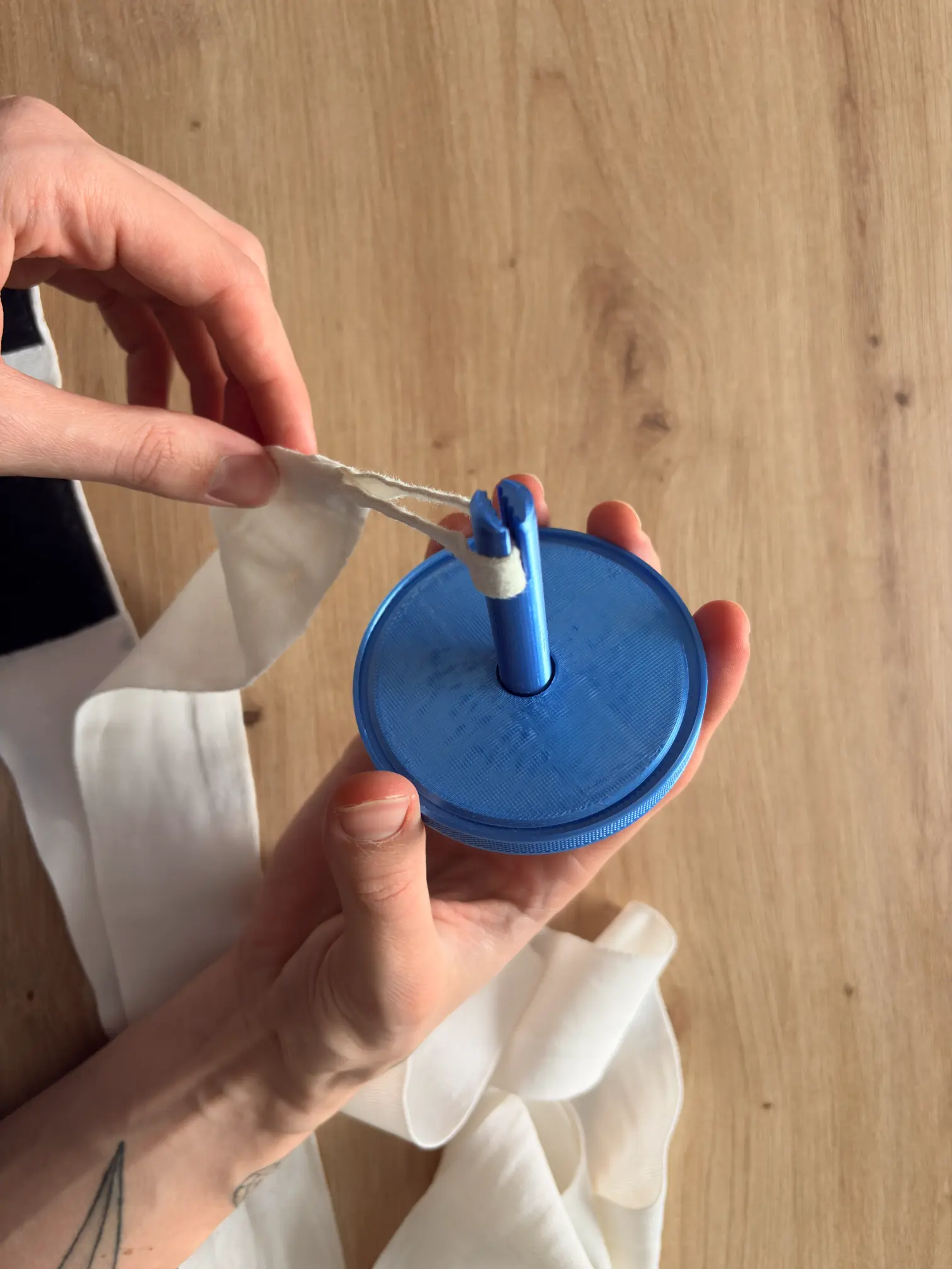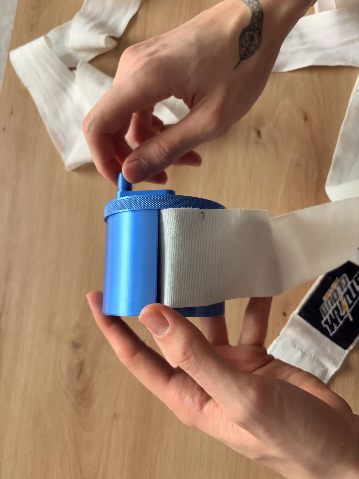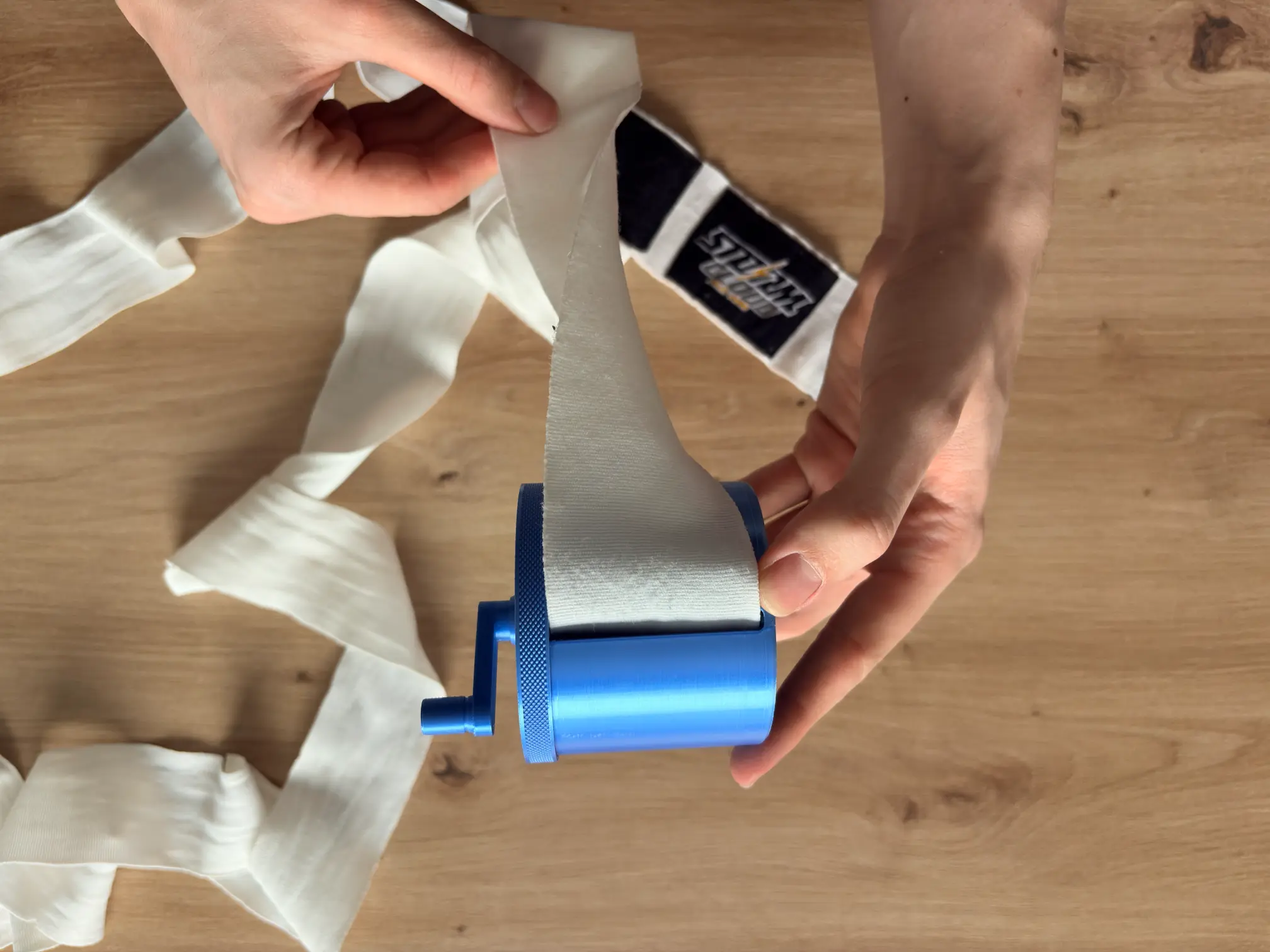 Obracaj korbkę płynnym ruchem — stabilne, lekkie napięcie pozwoli bandażowi ciasno i estetycznie nawinąć się na rolkę.